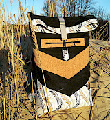 Varo is a rolltop backpack, and it comes in different styles (and sizes). Some kind of cork fabric and PU leather is always used. The backpack is huge inside (adjustable in it's height), but soft to your back, even if it's fully packed. Pattern by Hansedelli